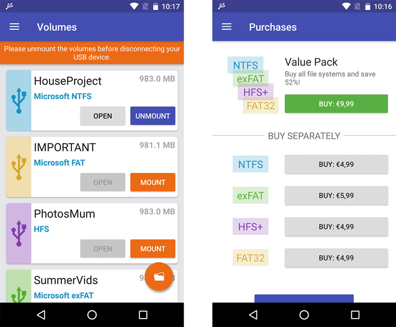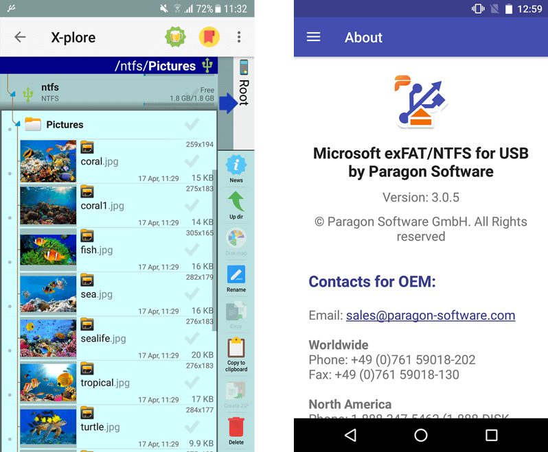 Microsoft exFAT/NTFS for USB On-The-Go firmy Paragon Software zapewnia dostęp do urządzeń pamięci masowej USB sformatowanych w popularnych systemach plików Microsoft Windows / macOS (HFS+, NTFS, exFAT, FAT32) dla urządzenia z systemem Android.